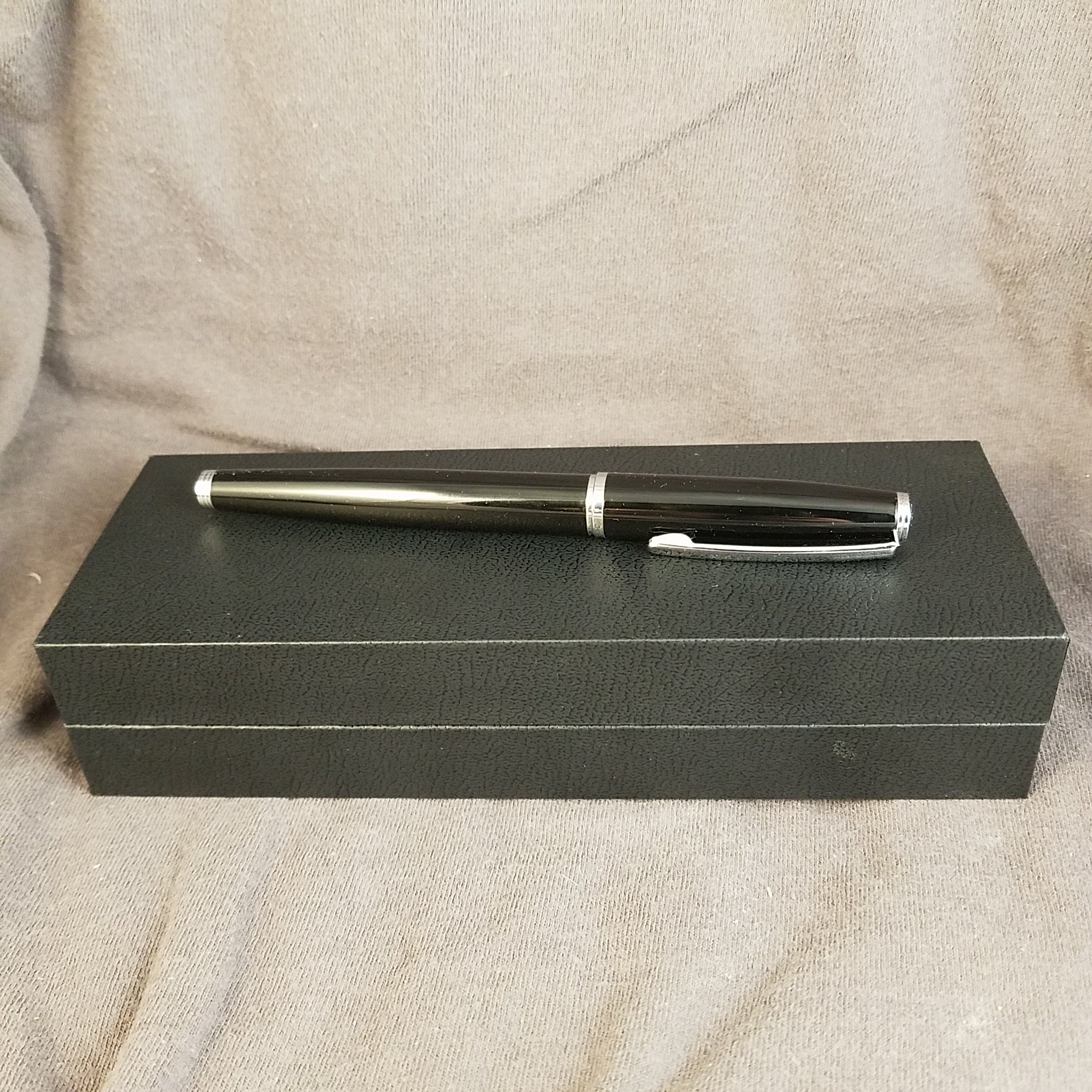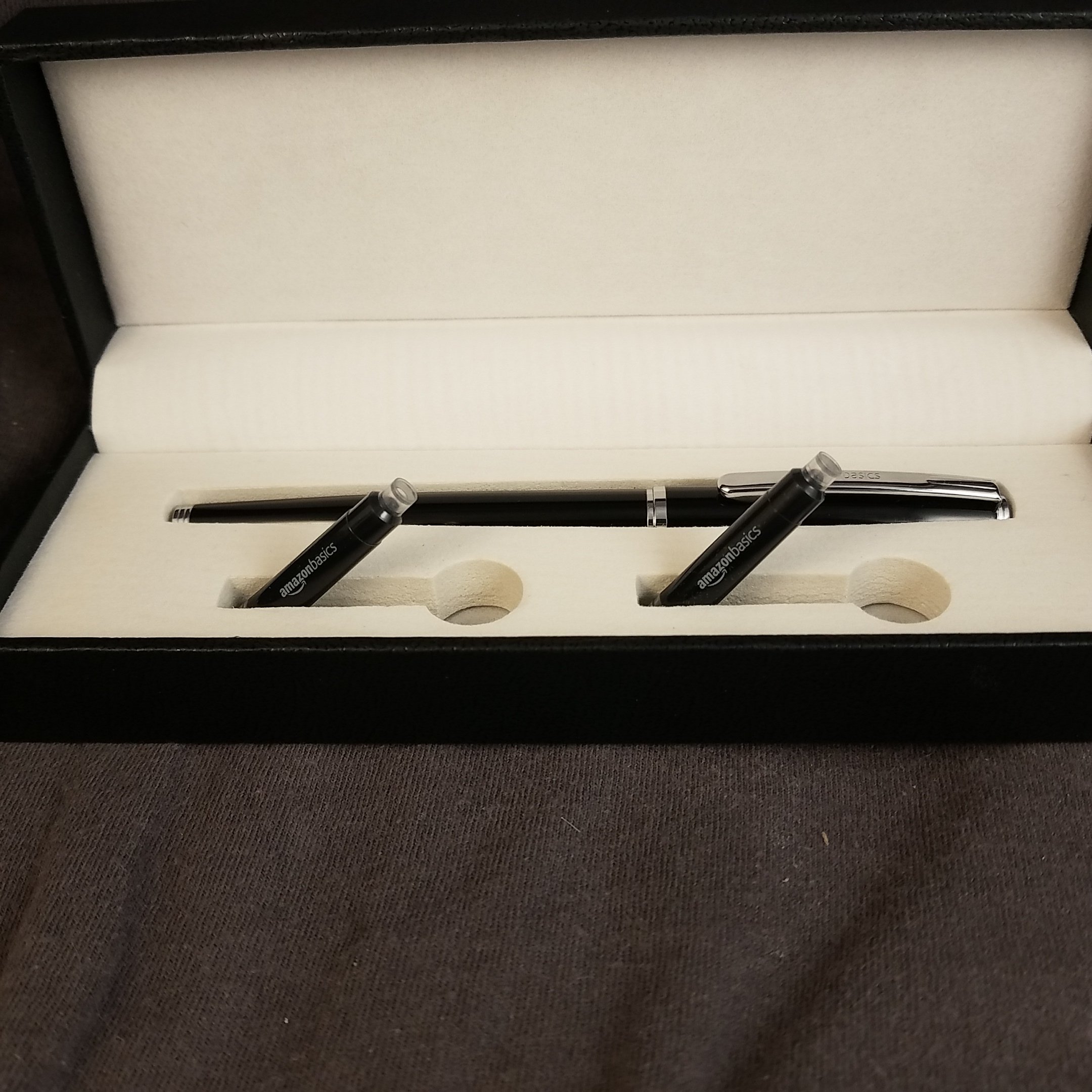 My thoughts on this pen are mixed. It’s okay. It has a very classic pen look- glossy black lacquer on a brass body and nicely done silver trim. The unadorned silver nib has only the M on it to designated the size of the nib. I think it’s a better pen experience for me than the Metropolitan, but the nib is not as nice. For $12 I think most folx would be better off buying a couple of WingSung 3008/9 etc. The AmazonBasics logo is a wart on this pen. The gift box is unadorned and could easily be repurposed to hold another pen for gifting. It’s a solid meh on this pen.