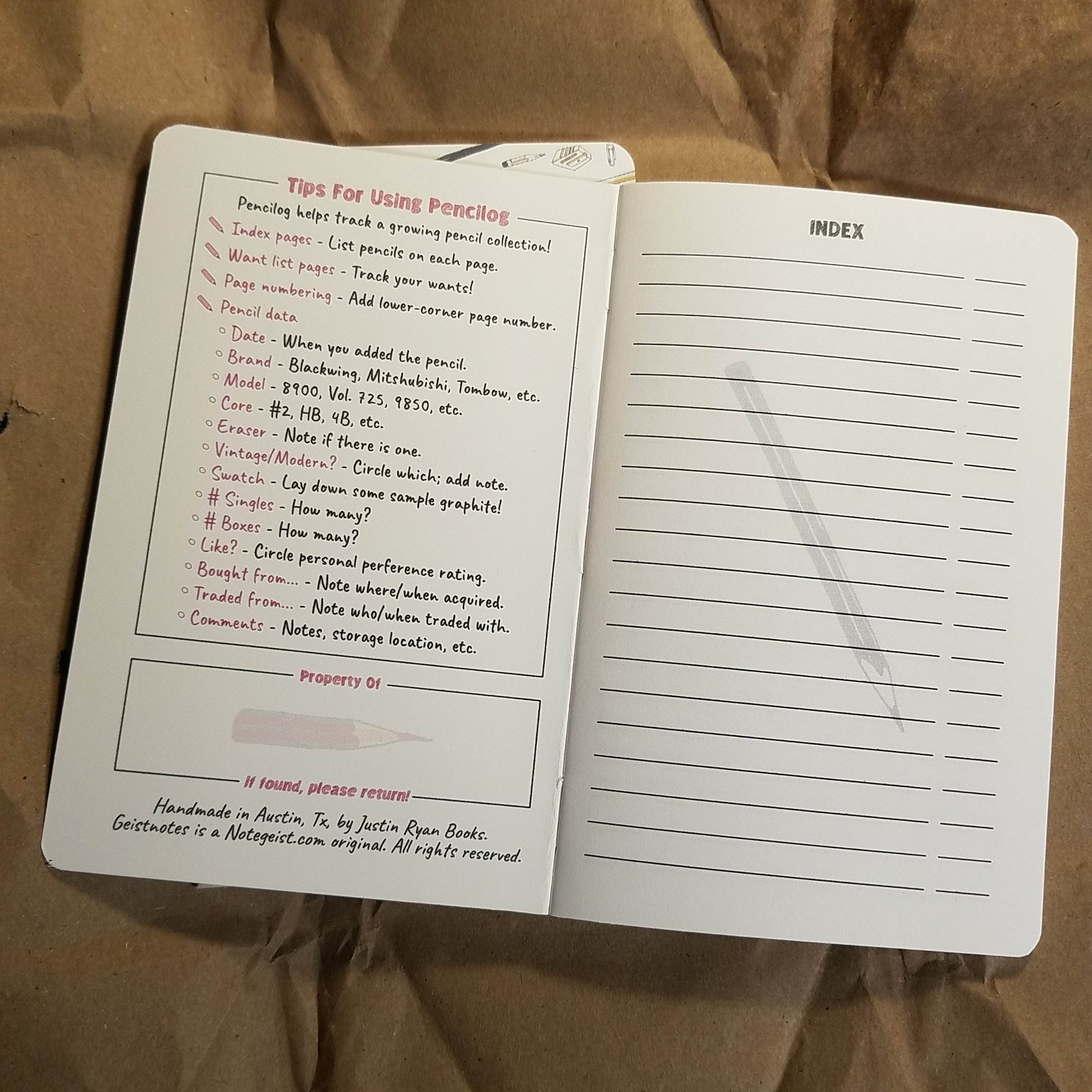 When Gary sent me over the Pencilog I was taken by it’s cute cover and the simple multi color print. I like both but the cyan and magenta toned one really strikes my fancy. At first glance it looks like any other 2-pack of pocket notebooks but with cuter covers; complete with a nice little belly band. Inside things are different. Inside each cover are interesting tidbits and then an index. Then the guts have a place to record the pencil. Some of the info is based on facts- brand, type, grade. Other information is subjective.
