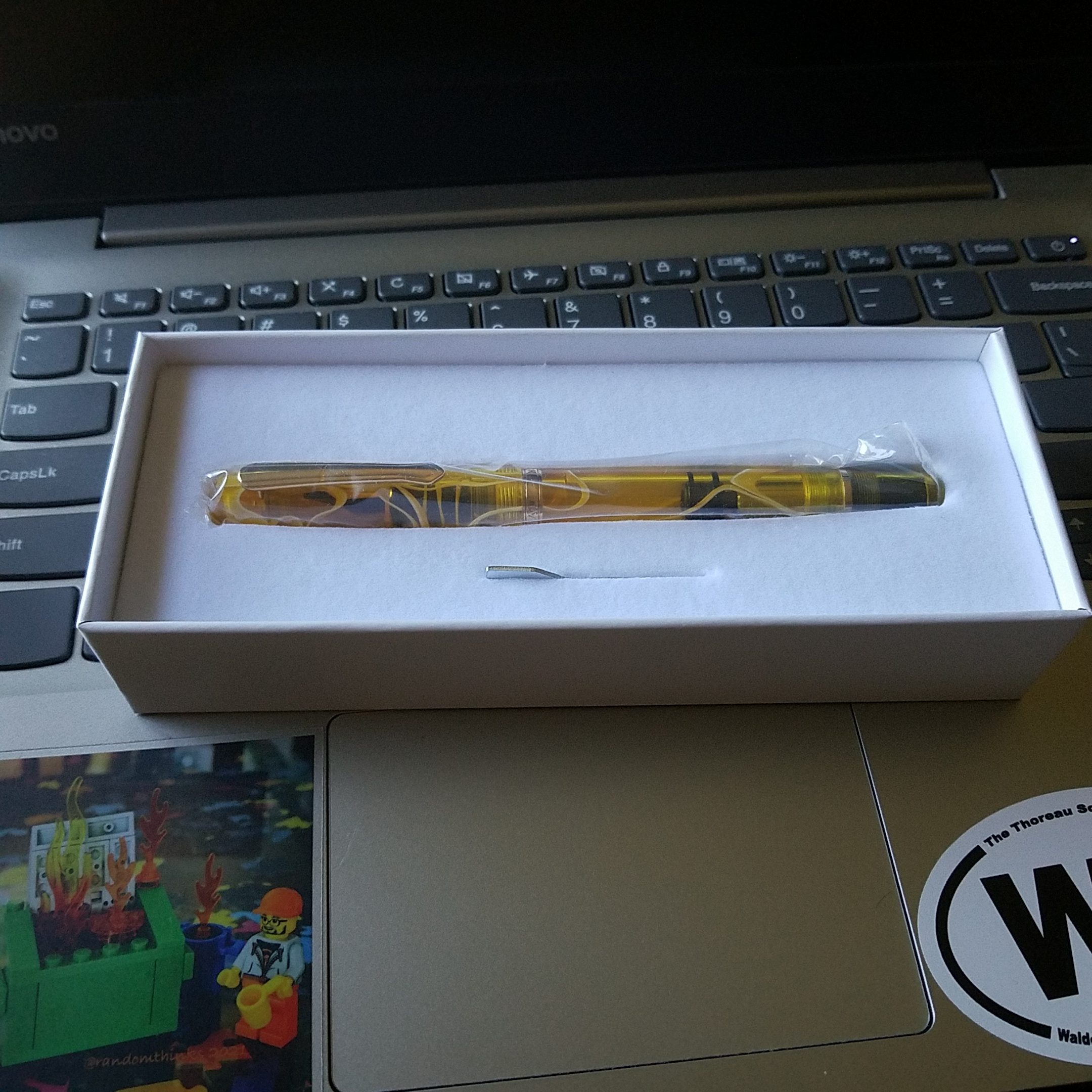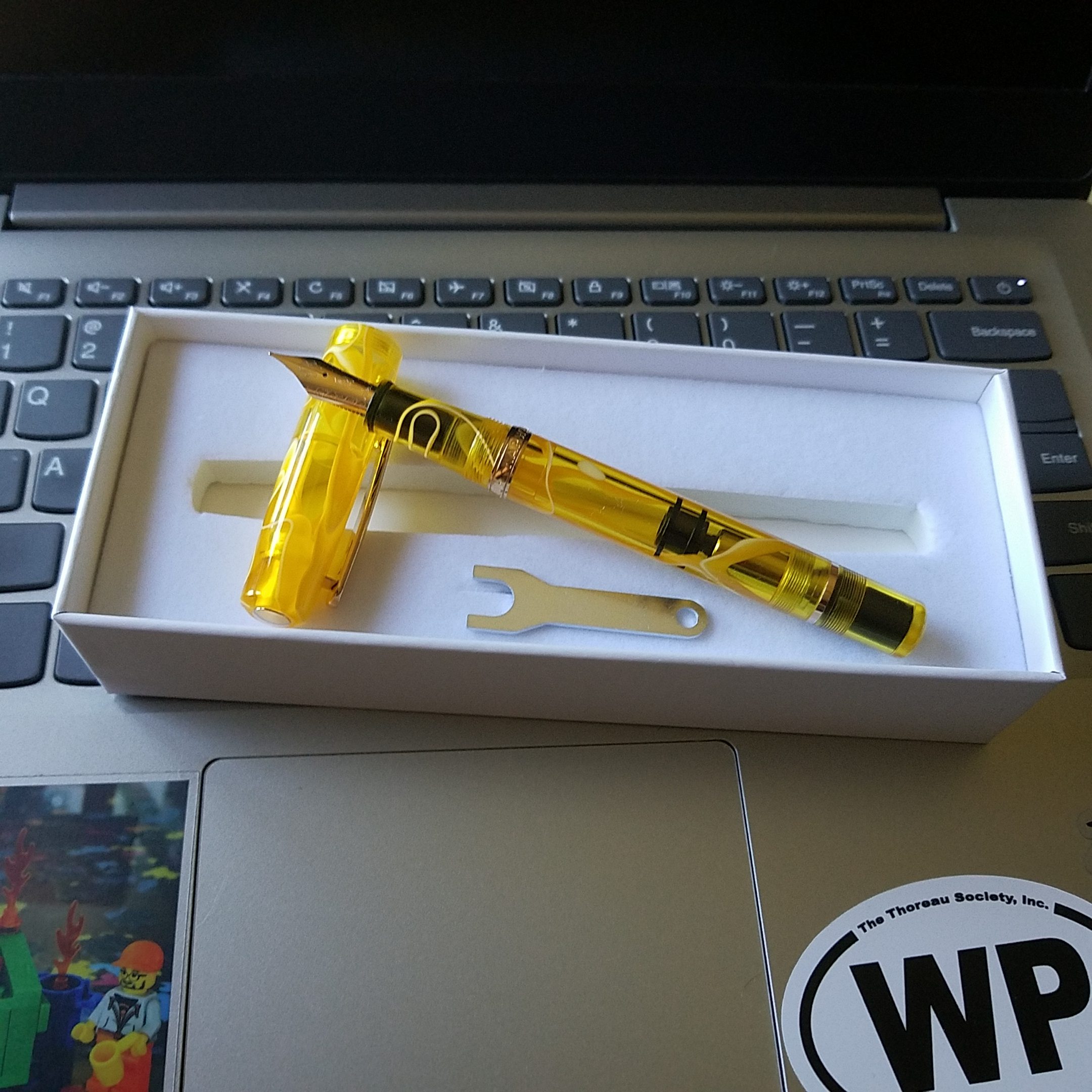 Narwhal Yellow Tang fountain pens popped up on my radar towards the end of 2020, and like many things in 2020, they stayed there on the edges of my vision, not being capitalized upon. Though they were in the running as a celebratory pen for purchase when I snagged my new job. When Goldspot reached out and offered me one to review I jumped on it fast! The little bubble wrapped package arrived in my mailbox a week or so later and I wasted no time cutting it open and peeking at the contents. I’d left it up to Goldspot to pick a color, though I was tempted to request a demonstrator. I am very pleased with the Yellow Tang original that arrived.
