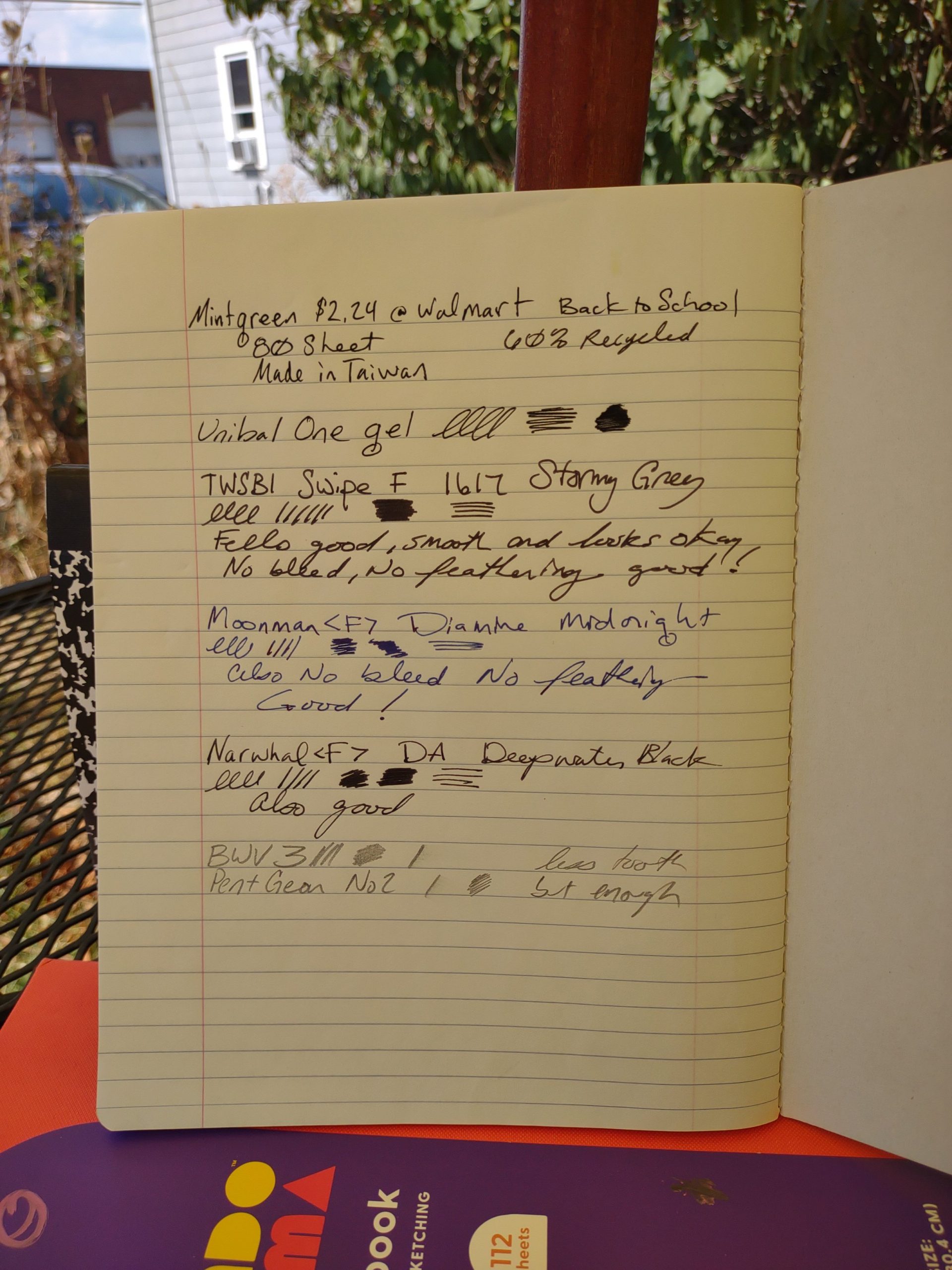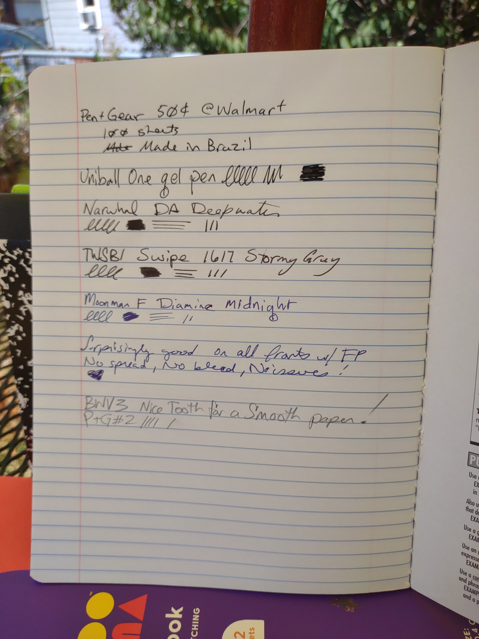 MintGreen lives to surprise. This paper handled everything I threw at it- from gel pens to fountain pens! The paper is smooth with skinny purple ruling and I like it, though it is a bit on the dark side for my usual tastes. Gel pen was flawless on this paper. Ballpoint too. Pencil was okay, there is tooth but not a ton, so the pencil is a bit faded out, but still plenty dark. Fountain pens did wonderfully here. Not a single feather but a bit of bleed through here and there. It wasn’t deal breaking but your wet nibs will make a mess.