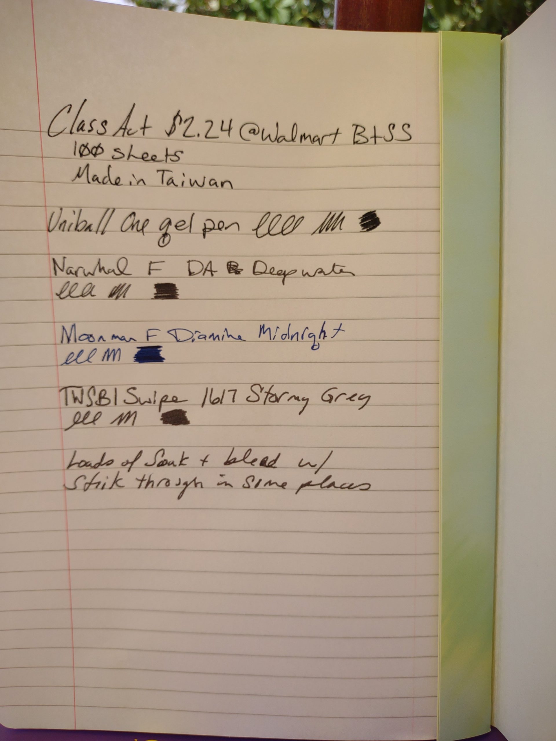 The clear winner from Walmart this year, and the notebook to stock up on is the Pen + Gear standard composition notebook. It has 100 pages of bright white paper and a decently stiff marbled cover. The stiffness is enough that you can fold the book over and write out of hand but it will bend. The spine tape is narrow but of an acceptable width. The stitching is great. The marbling is good too, there is a nice balance of black and white. These are available in a variety of colors.