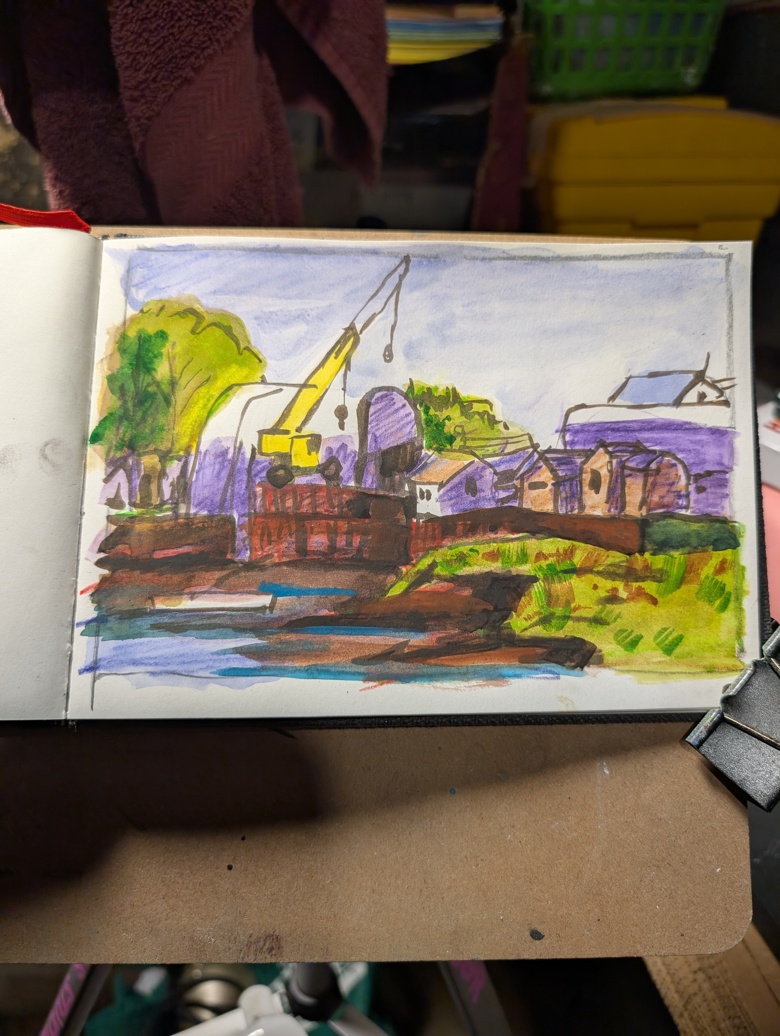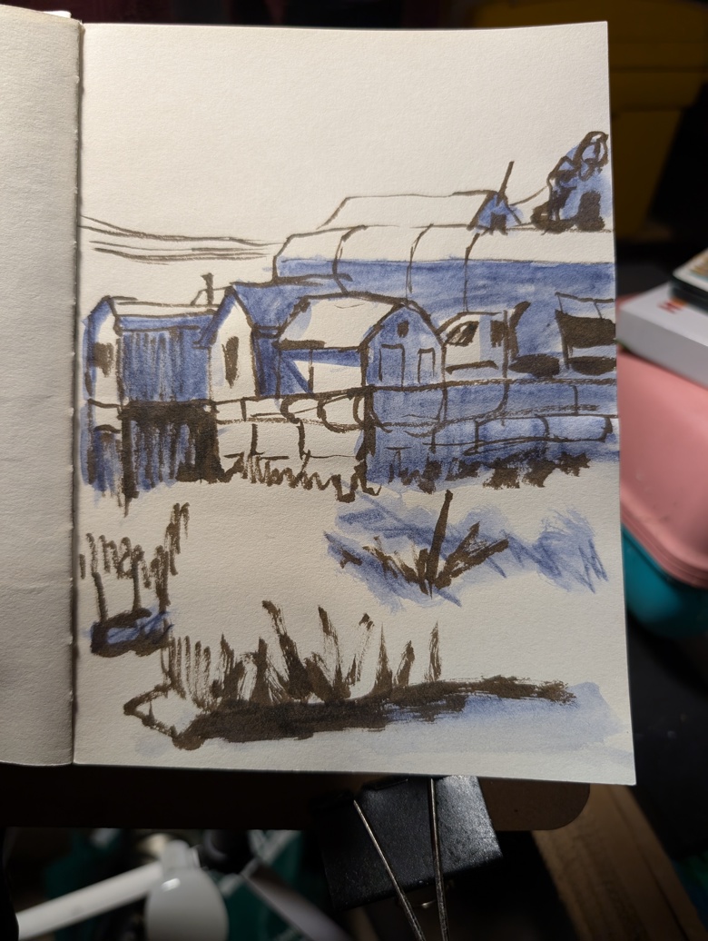 I did a couple of sketches of the backside of the boat sales and repair place. A place that on the street side has a tall privacy fence. The backside is a view of quanset huts and a variety of sheds.
