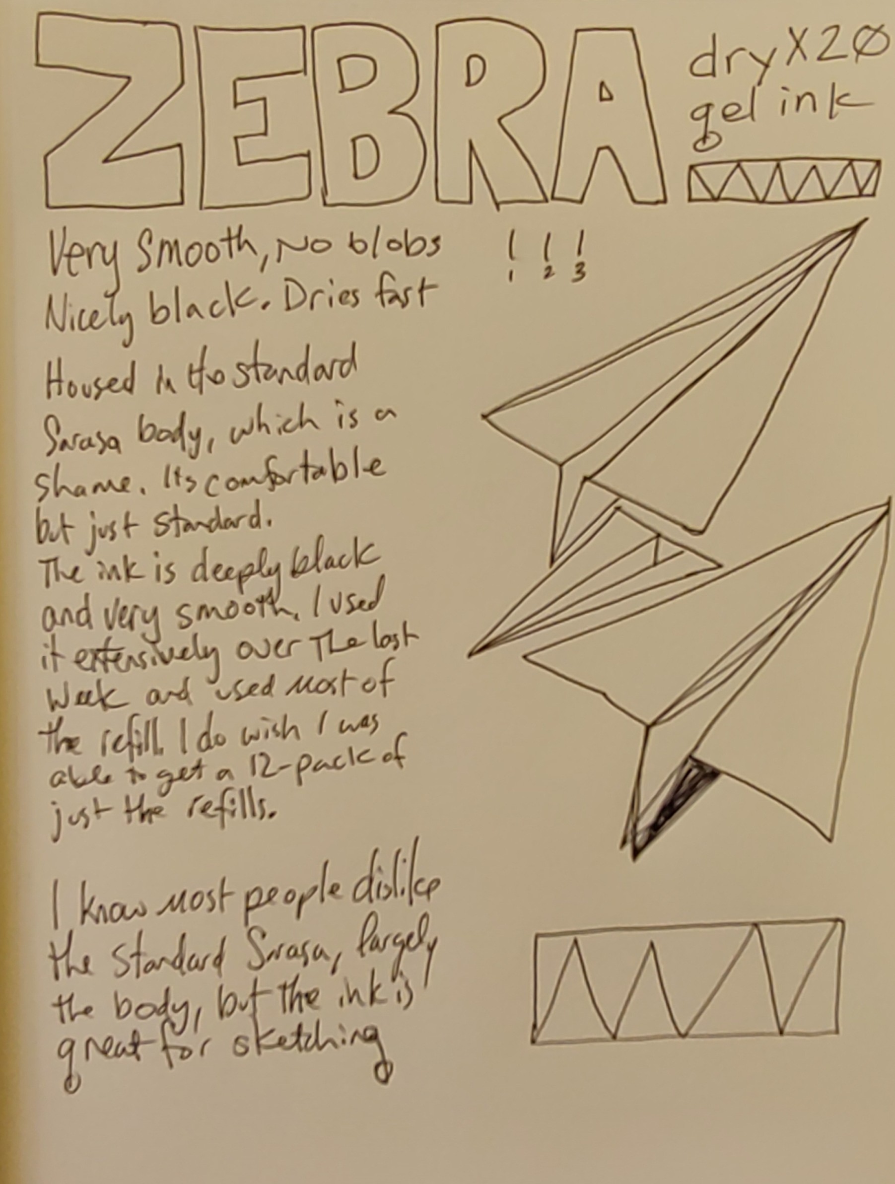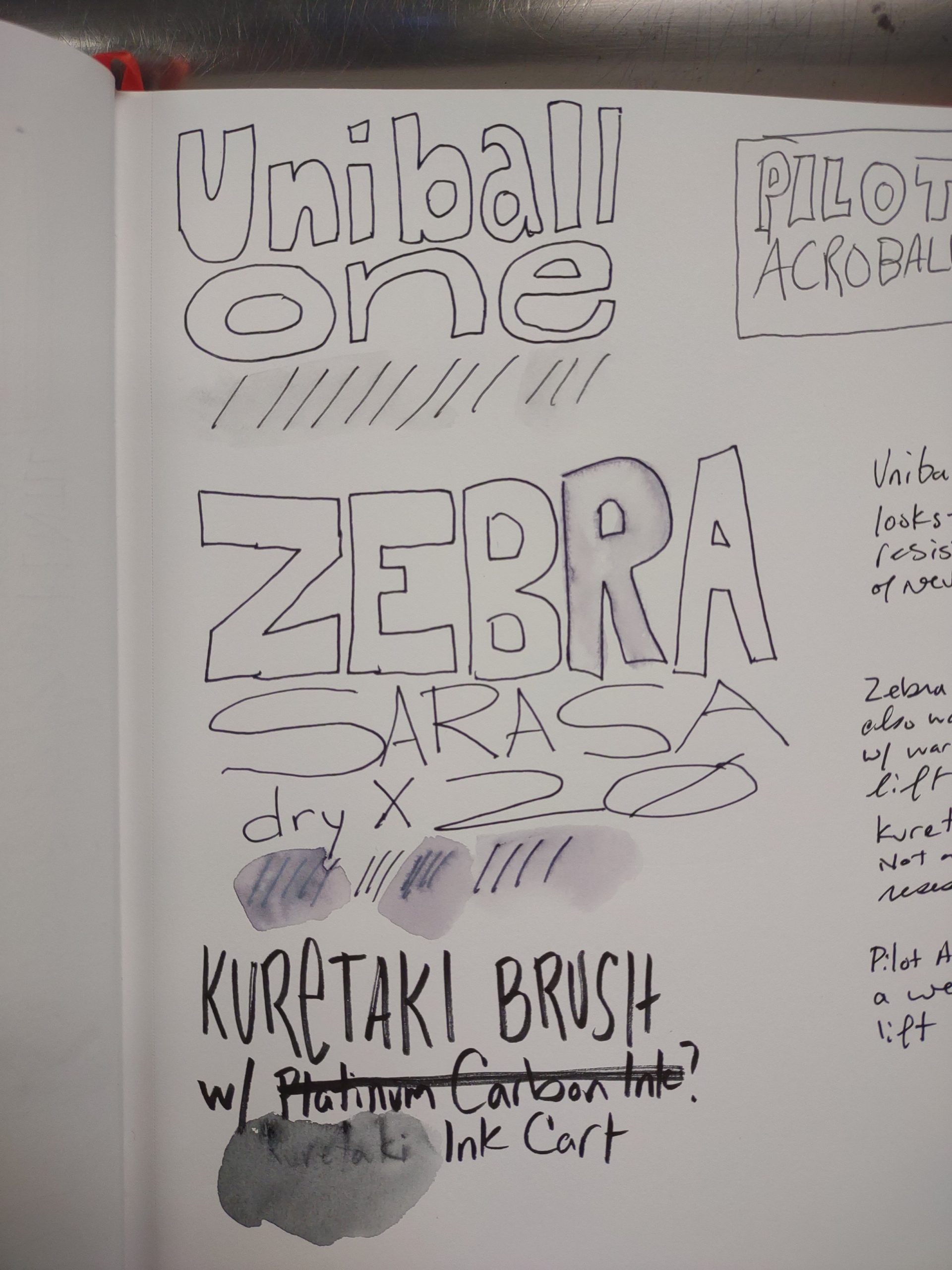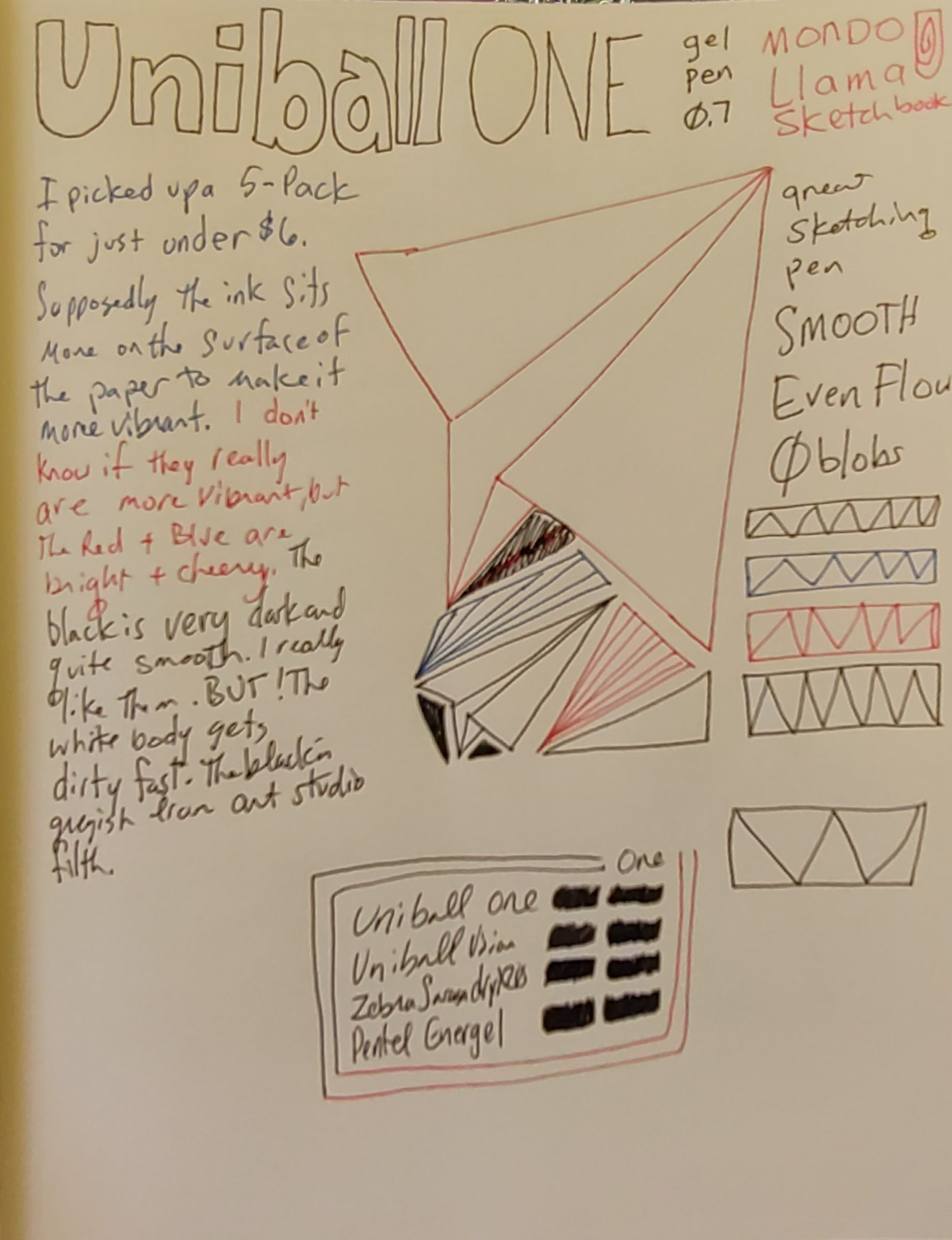 The paper is smoooooth and nice with gel pens and brush pens. It will accept the lightest of light ink washes. It will cockle and buckle a bit but seemed to settle back down once it dried. My usual wet and sloppy watercolors won’t fly here. I like this paper for sketching with gel ink, pen and ink, and pencil. It’s smooth enough my pens are skipping and jumping all over the place, and they didn’t feather or bleed through. The lines stayed where I wanted them to be. The bright white paper means colors look good on the page.
