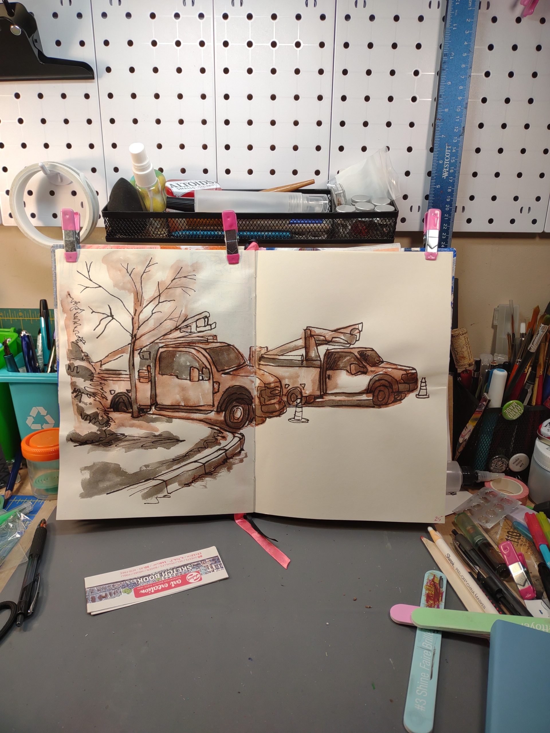 I’m using a combination of contour line drawing and looking at the tonal values- basically lines and shadows. I’m really digging faux ink wash combined with ink wash. REALLY digging using magenta ink on trucks.