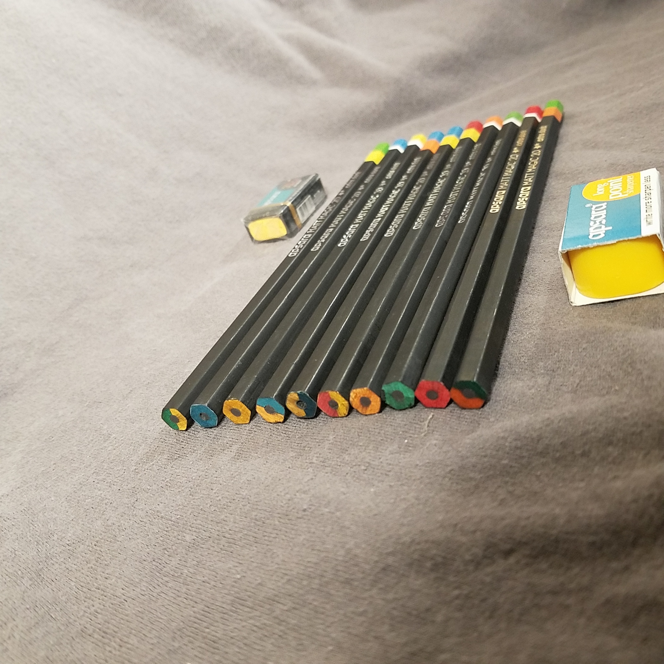 The 10 pencils arrive bundled with a long point sharpener ripe for hacking and a little plastic eraser. I’ve immediately started to use the tiny eraser. It’s perfect for pocket carry and mimics the pencils- the inside of mine is yellow and the outside is black. Cool.
