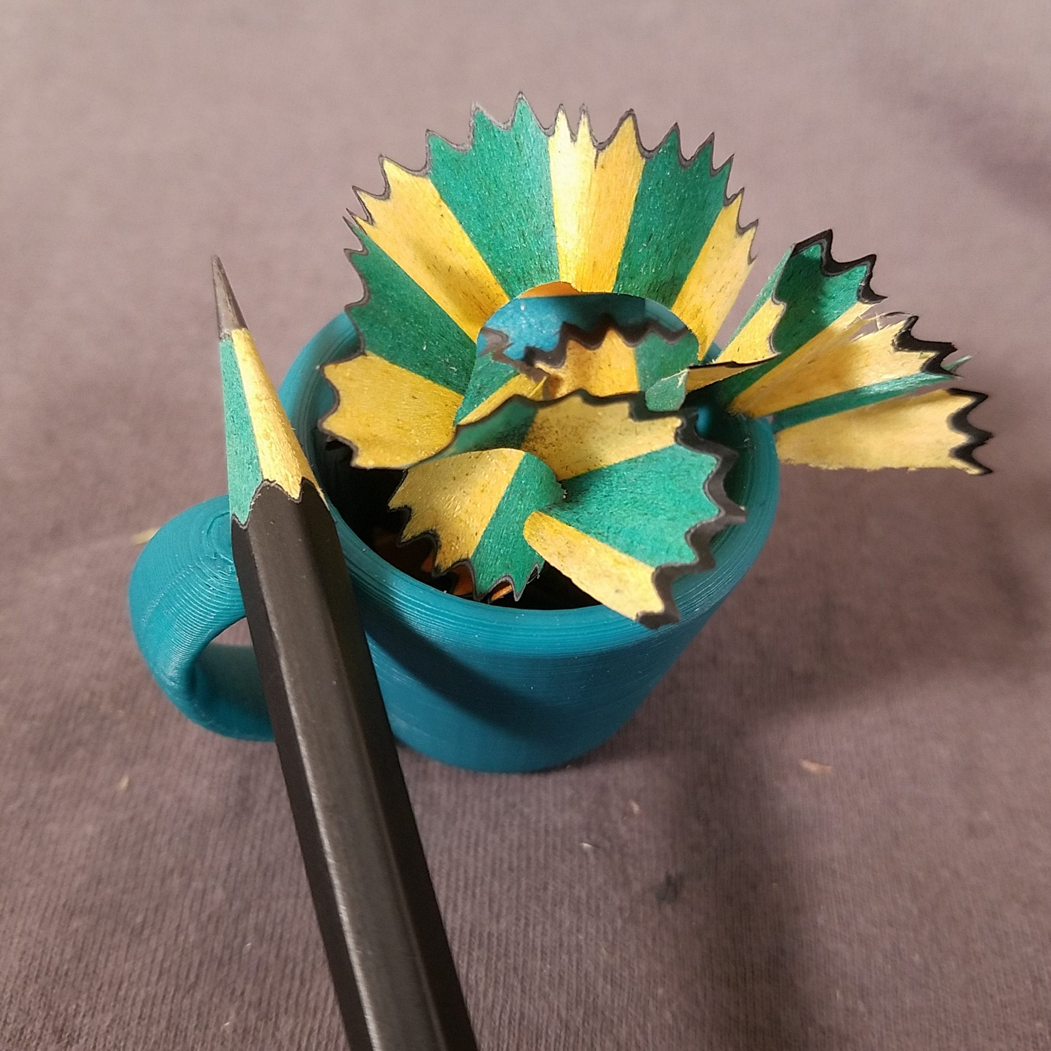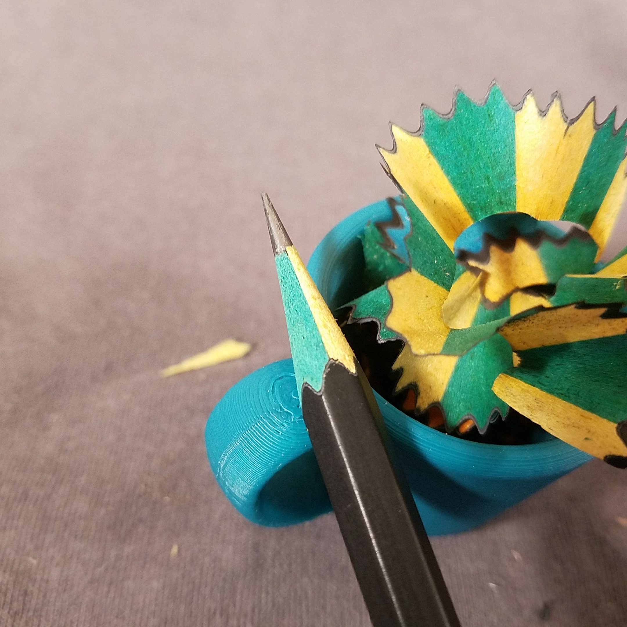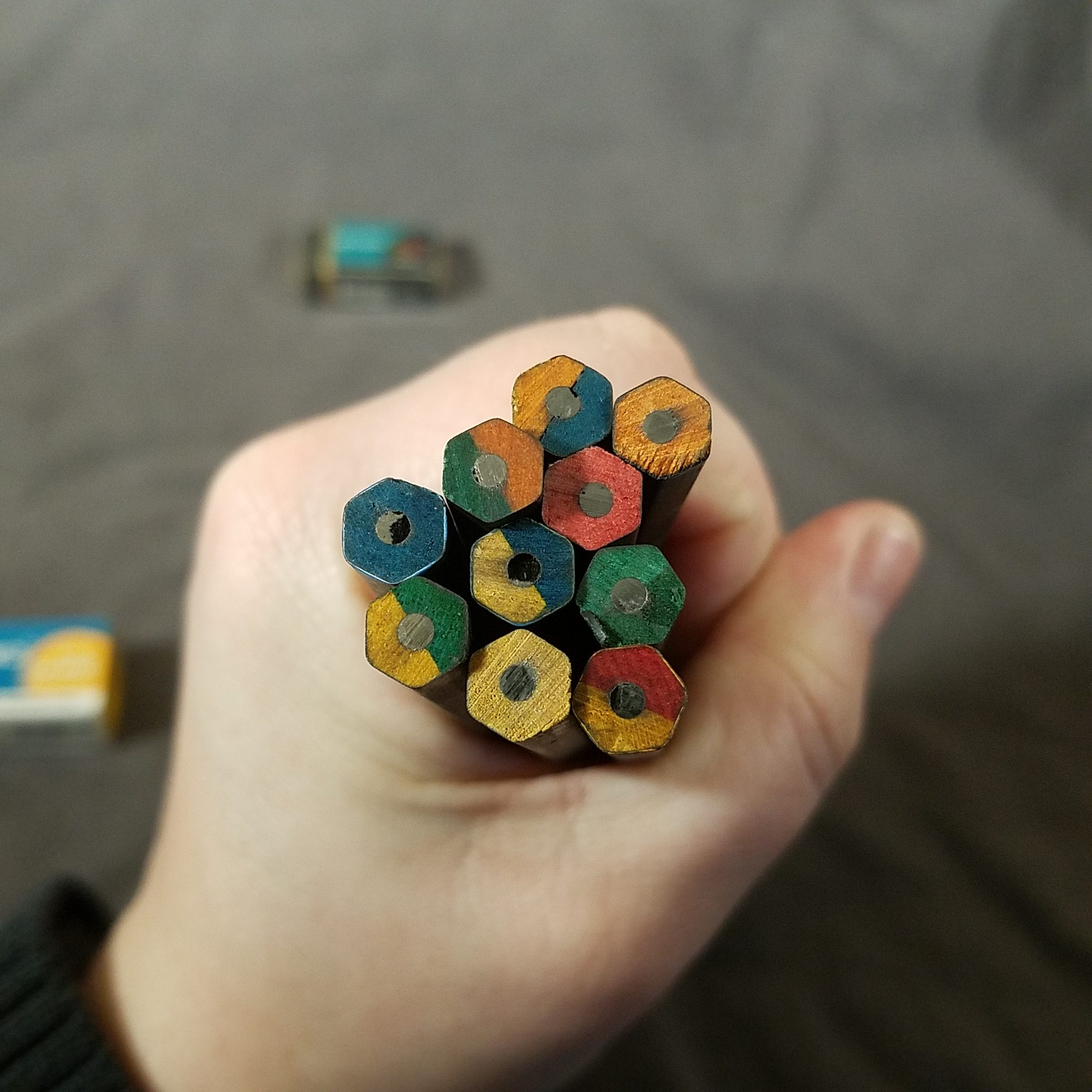 Inside the wood of the pencil, it sharpens like bass wood, is dyed a variety of colors. Some pencils have one color of wood inside, others have two colors. The end dips correlate to the colors inside! The mechanical coordination this must’ve taken in a factory pumping out millions of pencils is kind of mind blowing.