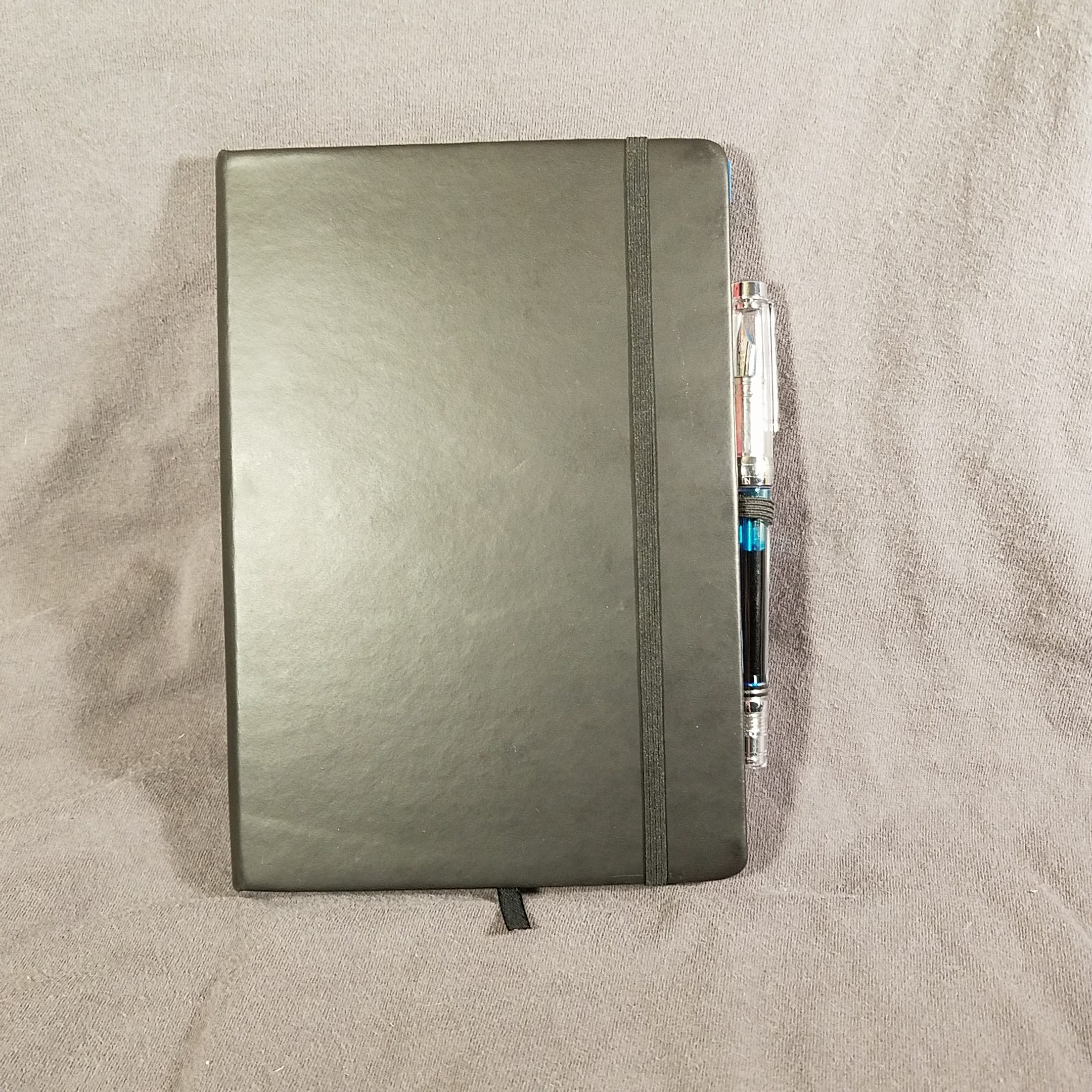 The back cover sports an elastic loop for a pen, it’s large enough to accommodate a fountain pen, mine is currently holding my Wing Sung 3013. But It’ll hold a Preppy snuggly. It will not hold a pencil. I find that it’s a tad narrow and my pen flops around a bit, but in my Lihit Lab Bag in Bag it’s fine.