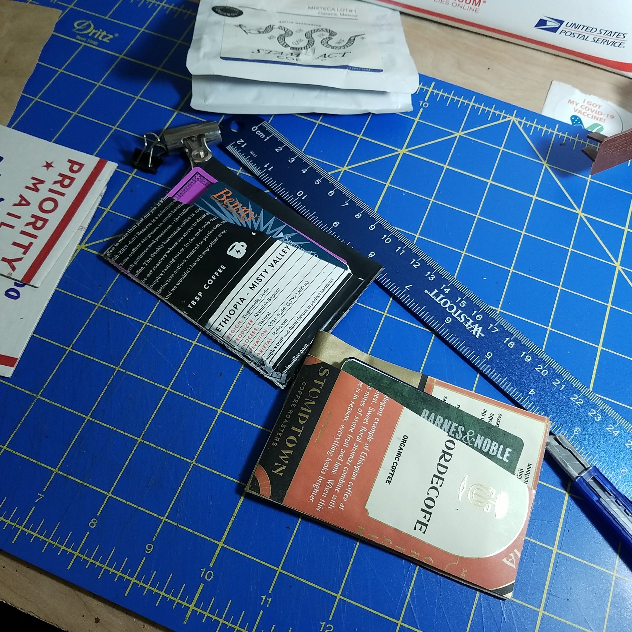 Many of the coffee companies I’ve been getting coffee from have changed the bags they use- they’ve gone from the tube style to a style that has 4 sealed edges or are short and squat. I welcome that they use less plastic but the lower amount of plastic means I don’t get to make the bifold bill fold wallet, since there just isn’t enough bag there to make one.