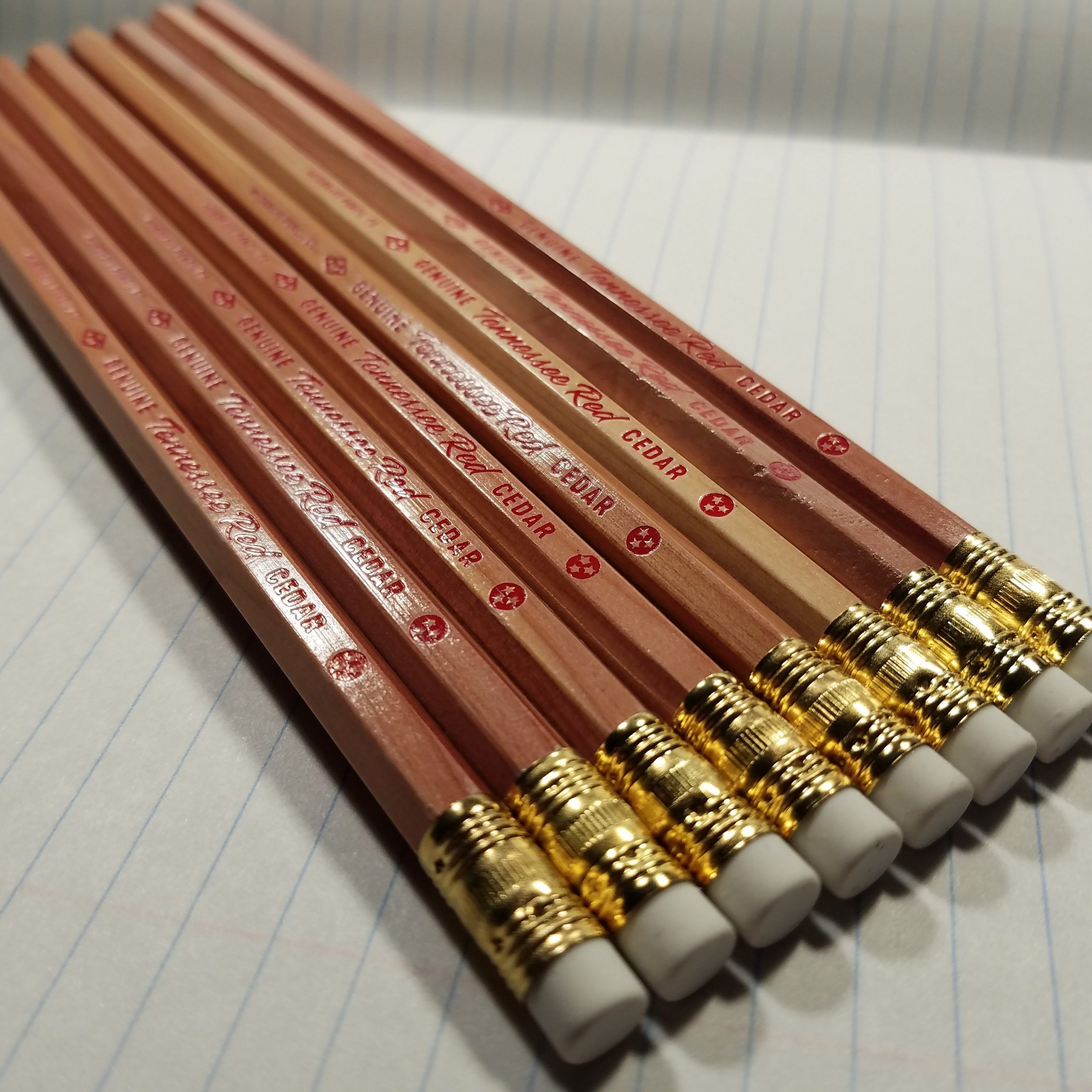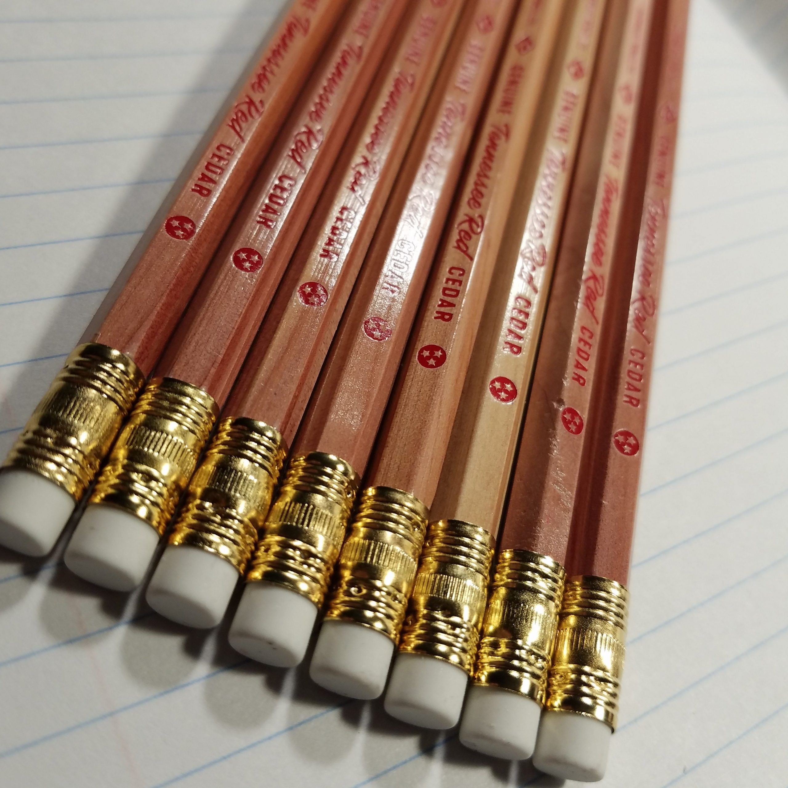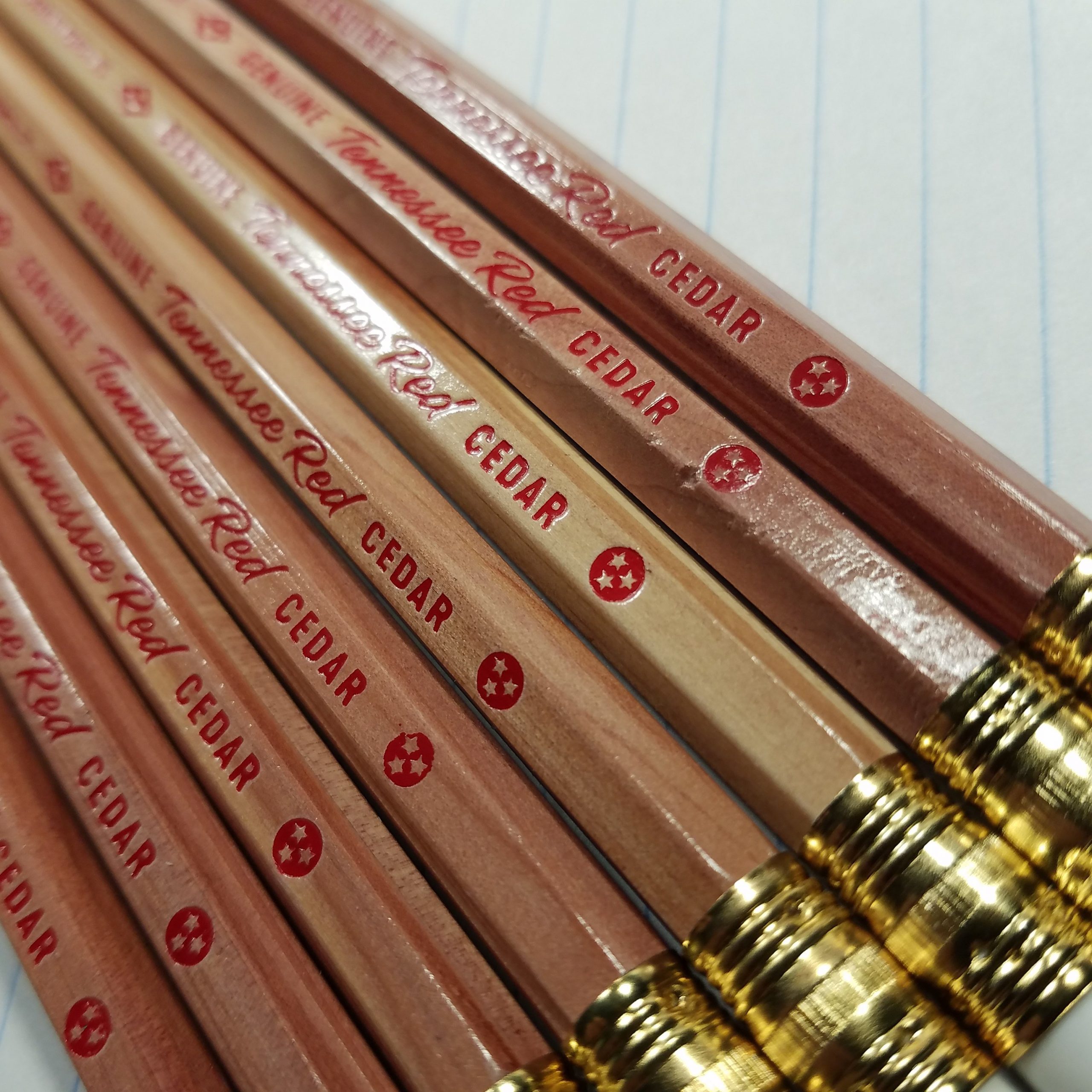 Nestled in the box are a dozen lightly but glossy lacquered natural pencils. I wish they were raw wood, but I can’t win every time. Even with the light lacquer you can smell the cedar as soon as you open the package. Once sharpened my whole office smelled of cedar. Amazing. The red imprint is perfect and sharp and has historic calls out with the little 3 star Tennessee logo and the new Musgrave logo. A golden ferrule holding a crisp white eraser completes the look. An added bonus is that the eraser? It works. Which has been a point of steady complaint over the years. They work well too.